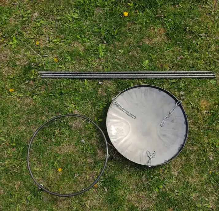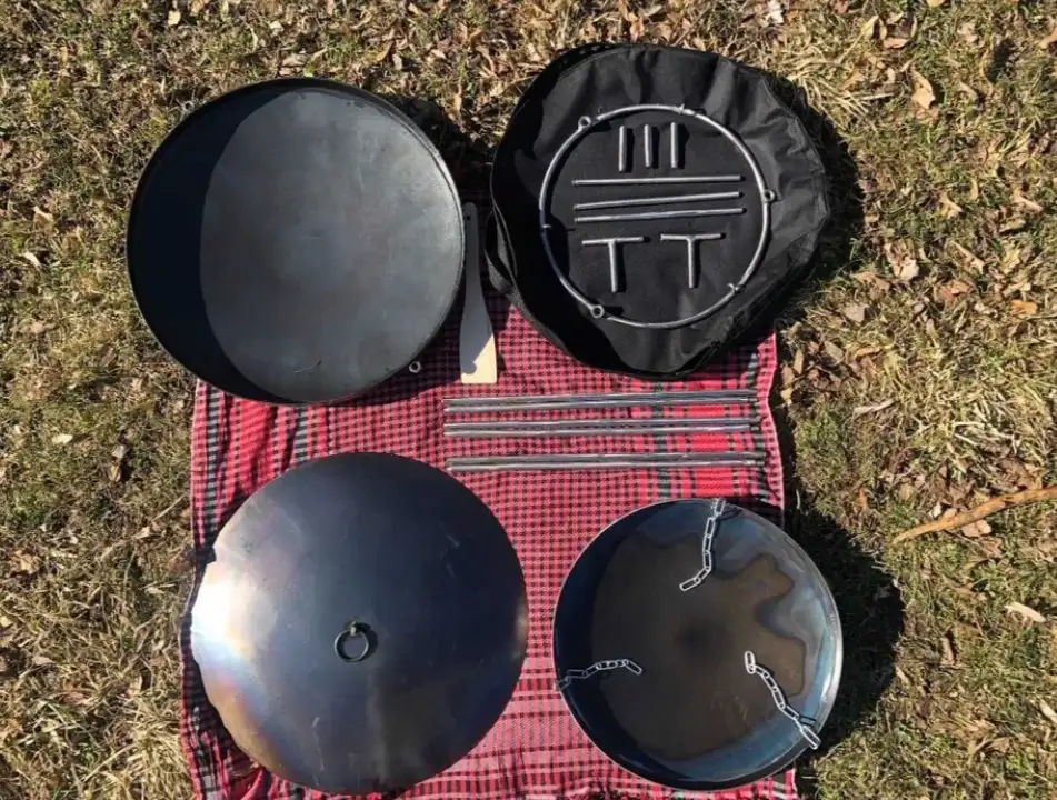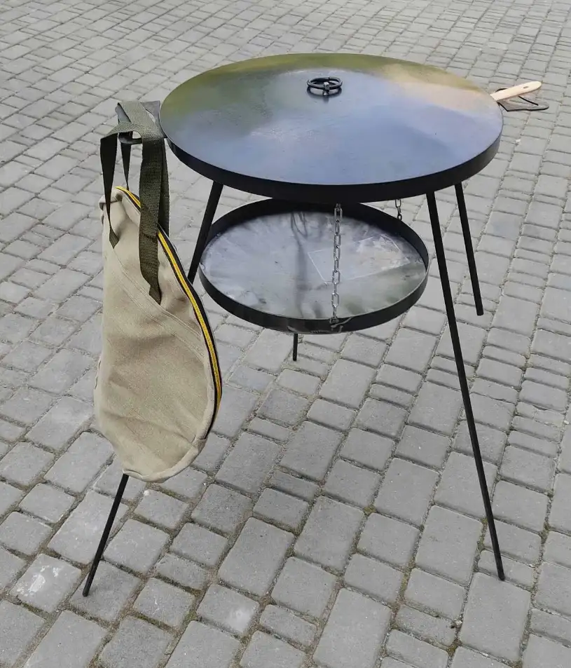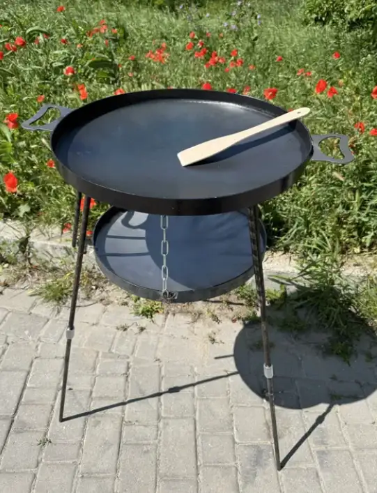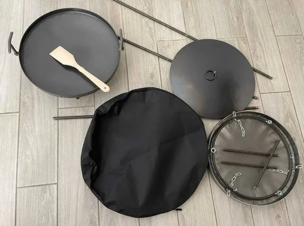 в комплекті: - сковорода діаметром 40-50-60см - кришка 40-50-60см - підвіска САДЖ на розбірних ніжках ніжках - чохол діаметром 50-60см - ніжки по 25см -дерев'яна лопатка